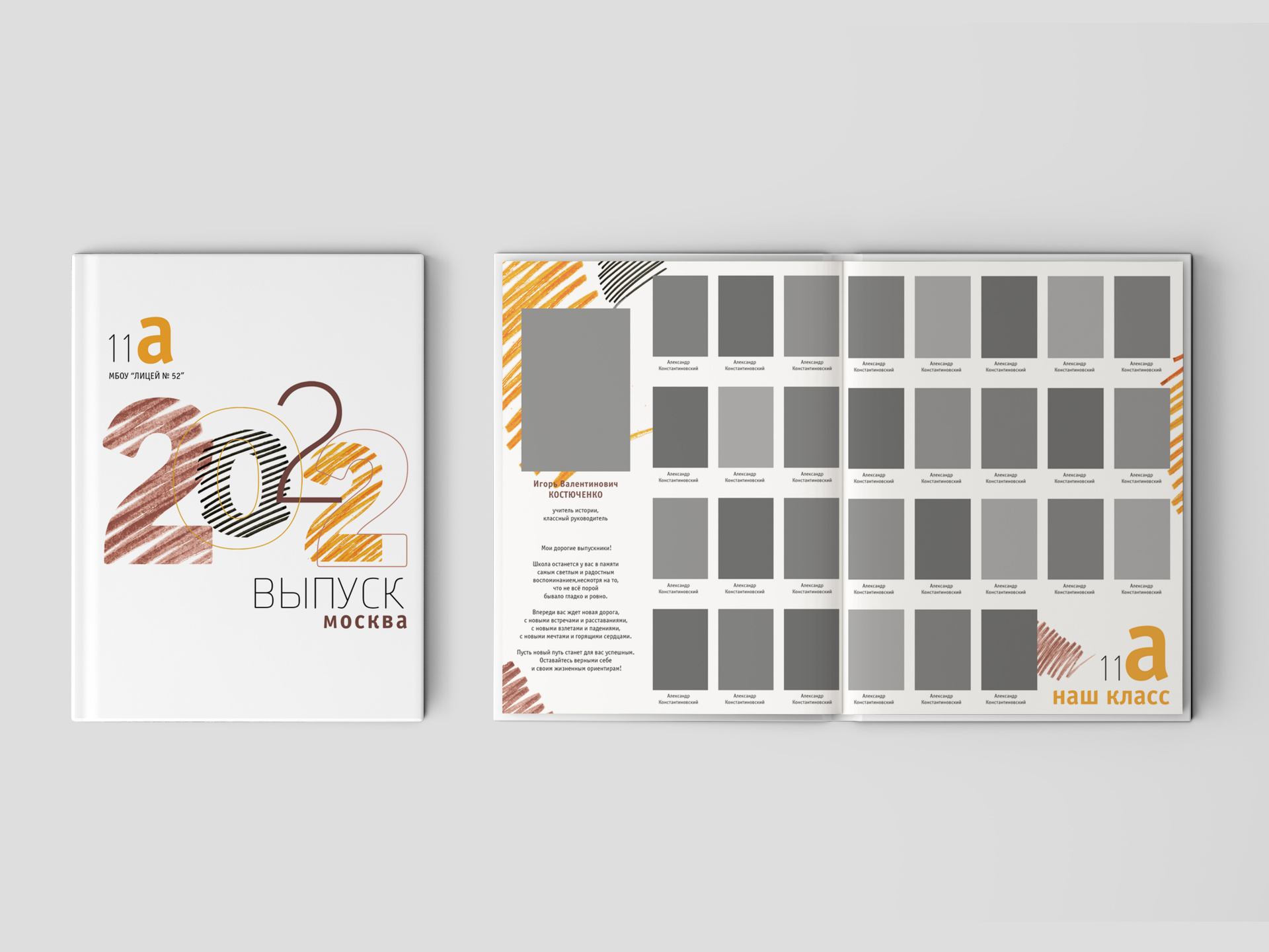 1 разворот: крупный портрет ребенка, портрет классного руководителя и других преподавателей, пожелание от учителя.